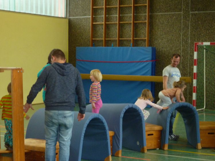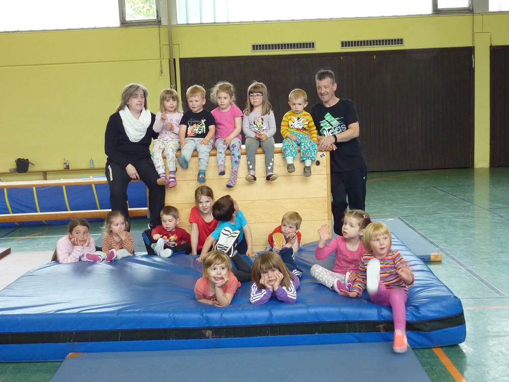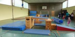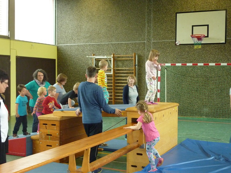 Das Eltern-Kind-Turnen mit ca. 25 Kindern im Alter zwischen 2 und 5 Jahren findet mittwochs von 16.oo bis 17.oo Uhr statt.